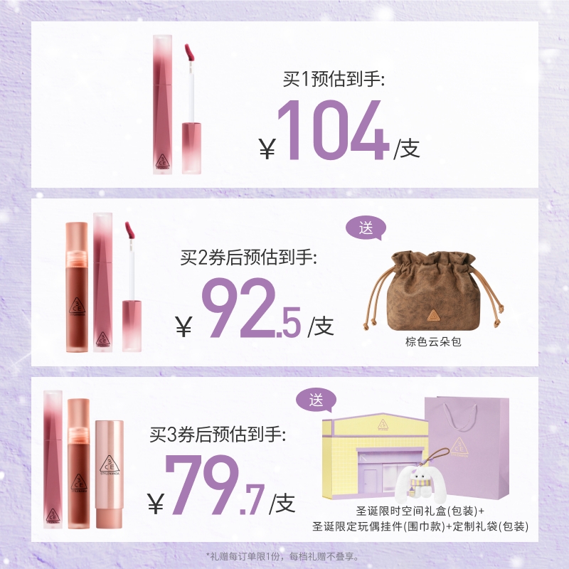:原价357元,现在领取88元优惠券,预估到手269元,【彩妆礼物】3CE水雾唇露唇釉口红持久;标价357到手三支191.84单支63(357-45立减-88淘客券-16.77淘金币-28.56美妆券-215消费券)赠送圣诞限时空间礼盒(包装)+圣诞限定玩偶挂件(围巾款)+定制礼袋(包装)半透质感包装,轻透露水质地,一抹瞬间水光变哑光,一抹成膜,持久不脱色,轻若无感,宛如天生唇色~【赠运费险】