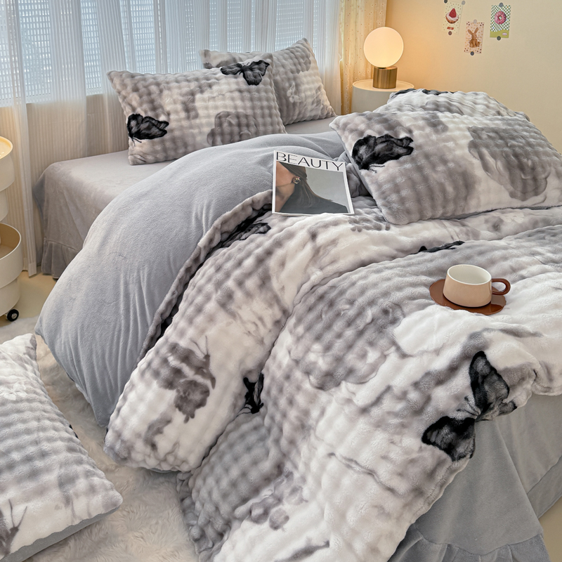 A【良品本色】高奢皮草绒印花四件套兔兔绒牛奶床品大泡泡四件套