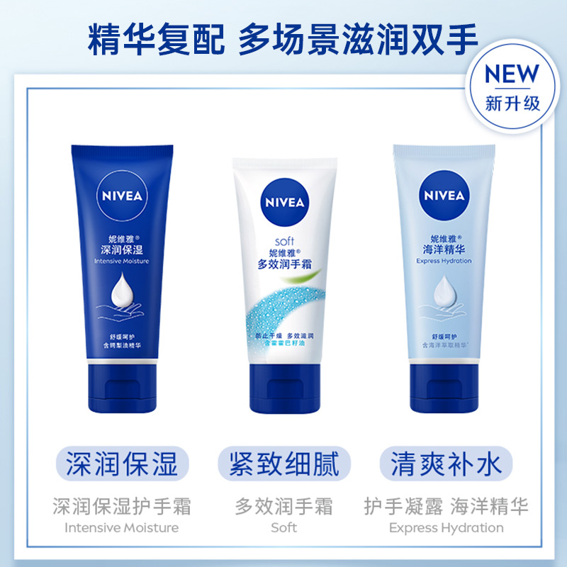 妮维雅海洋精华护手霜滋润保湿防干裂50g*2+专研洁面小样30g*2支