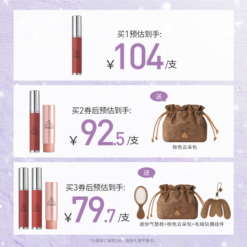 :原价312元,现在领取88元优惠券,预估到手224元,【彩妆送礼】3CE奶唇泥3件;搜索淘金币抵扣19.08到手204.92叠加88vip消费券200-25到手179.9拍三件赠送迷你气垫梳+棕色云朵包+棕色毛绒挂件! 【彩妆送礼】3CE奶唇泥,铁锈棕李子冻口红唇釉官方