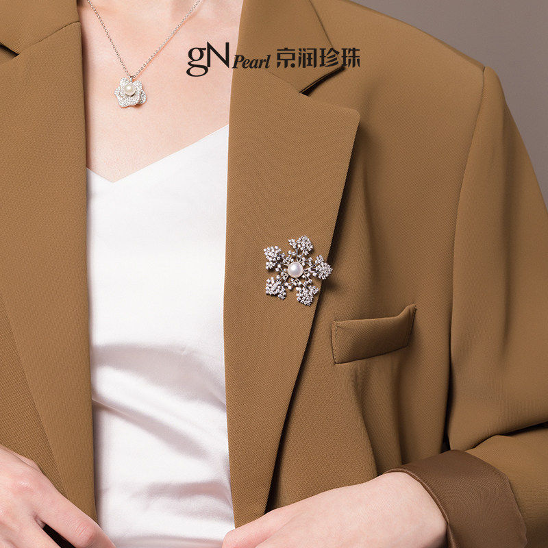 京润珍珠 雪晴珍珠胸针9-10mm雪花西装胸花别针晚宴礼服胸针D