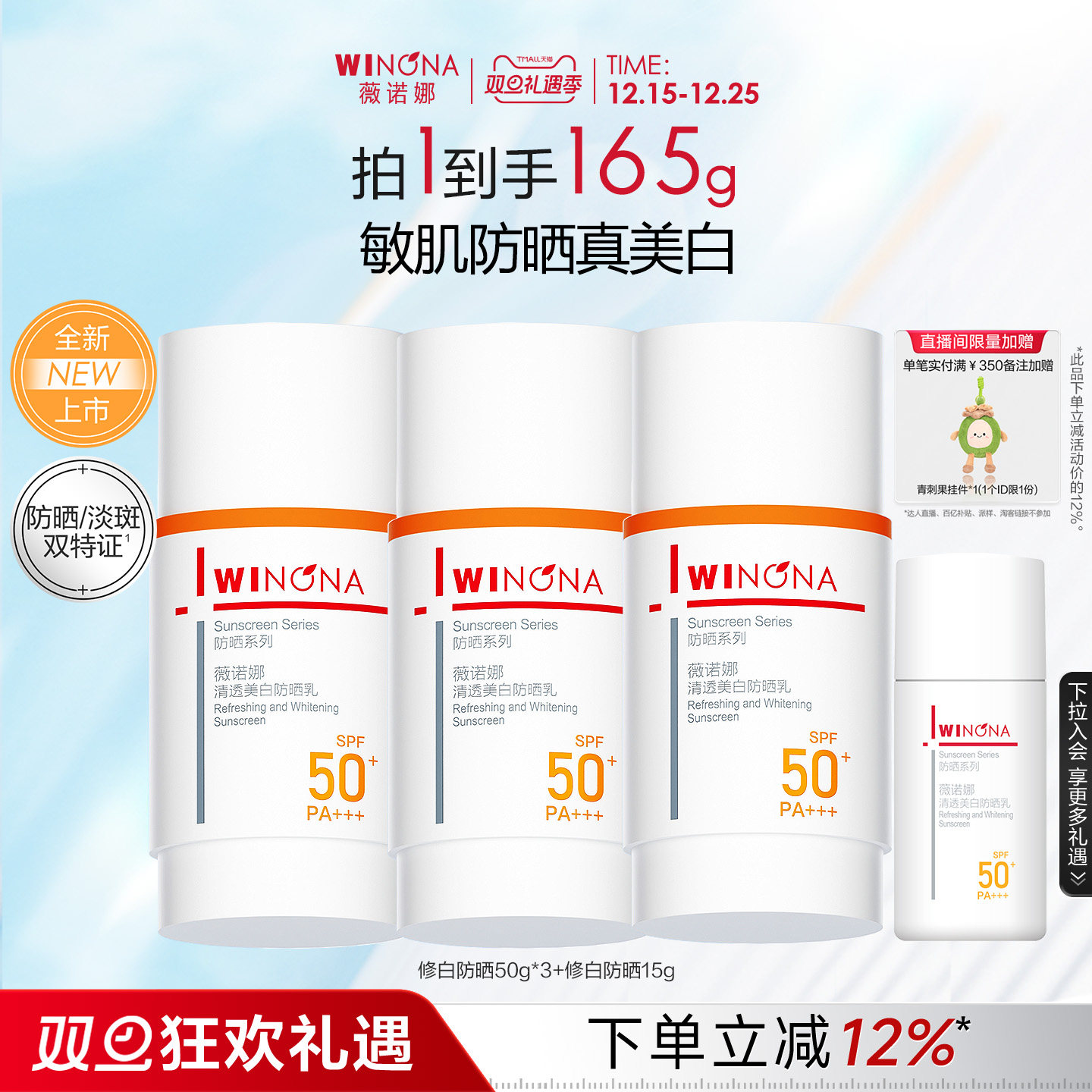 :原价298元,现在领取27元优惠券,预估到手271元,薇诺娜清透美白防晒乳霜隔离;薇诺娜清透美白防晒乳霜隔离50g赠送同款15g*2!敏感肌防晒真美白!