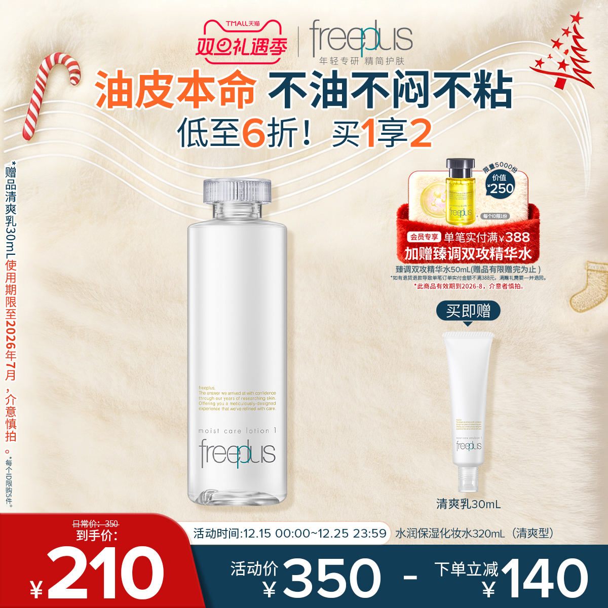 :原价200元,现在领取61元优惠券,预估到手139元,freeplus芙丽芳丝爽肤水160ml;【买即赠清爽乳30ml】油皮本命,不油不闷不粘,精简护肤,绽放水润光感,清透充盈不易粘腻!