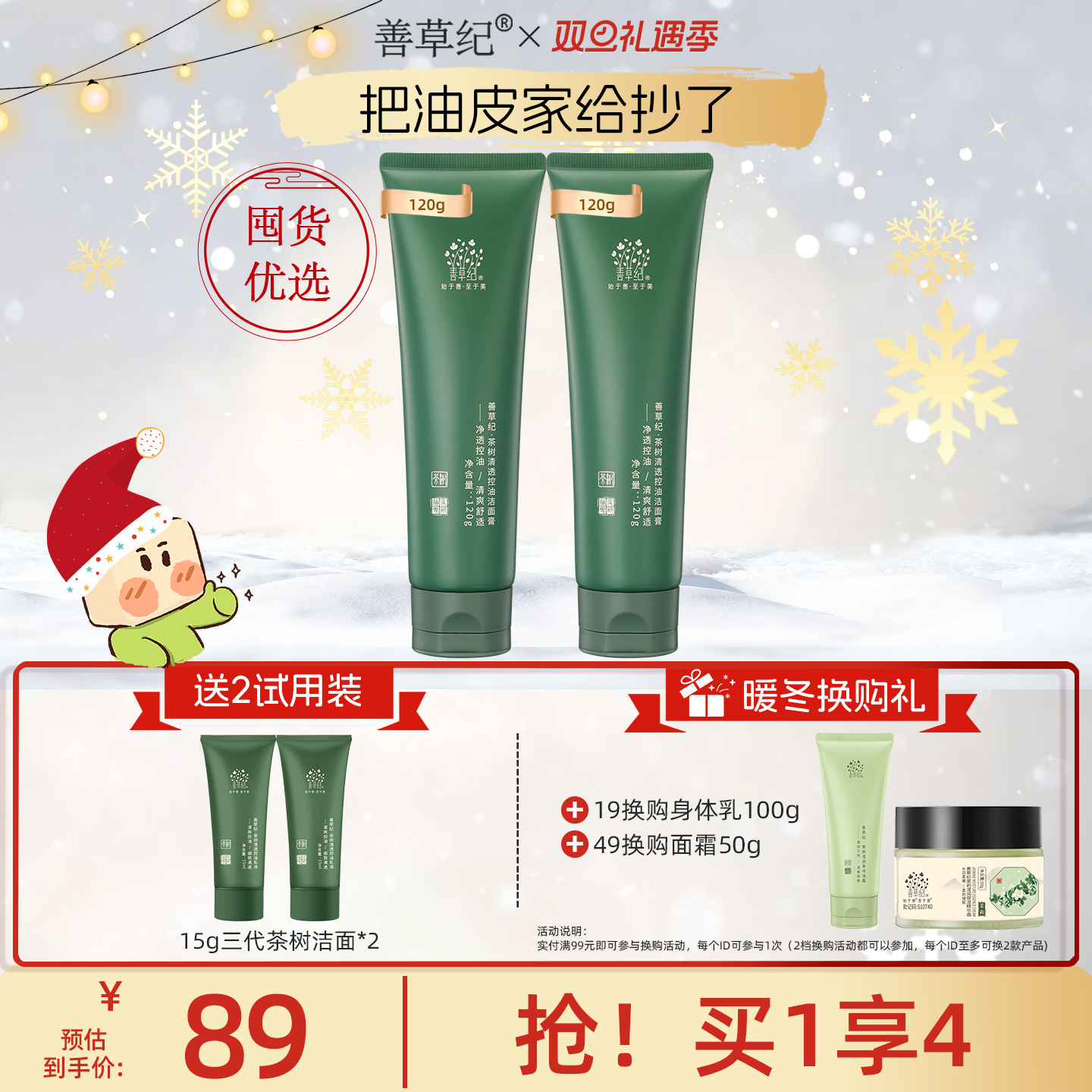 :原价56.9元,现在领取23元优惠券,预估到手33.9元,善草纪三代茶树洁面氨基酸洗面奶;黄金比例复配,更温和更清洁更控油,37℃自然结晶体系,减轻皮肤负担,乳膏两态转化,使用易推开,丰柔泡沫,一次即净!
