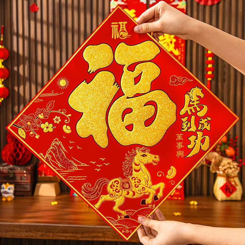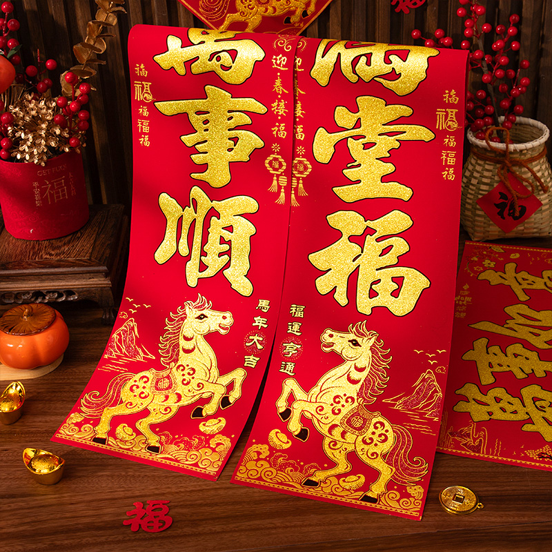 马年对联春联2026新年新款植绒对联贴门福字春节家用贴纸过年装饰
