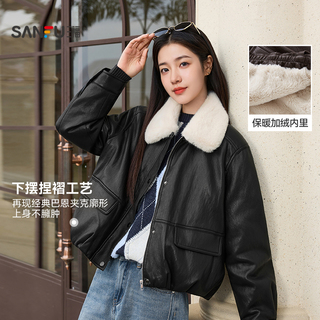 三福厚外套女2025新款冬季保暖加绒皮夹克毛绒翻领上衣女装511706