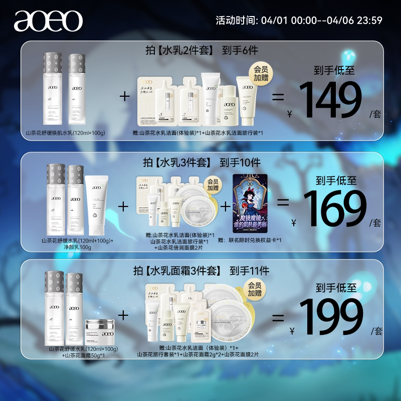 :原价149元,现在领取20元优惠券,预估到手129元,AOEO山茶花舒缓焕肌水乳套装;山茶花精华水乳套装,熬夜救星+紧致抗皱+深层保湿!!提亮肤色!水嫩弹润!自然无添加!熬夜党必备!!