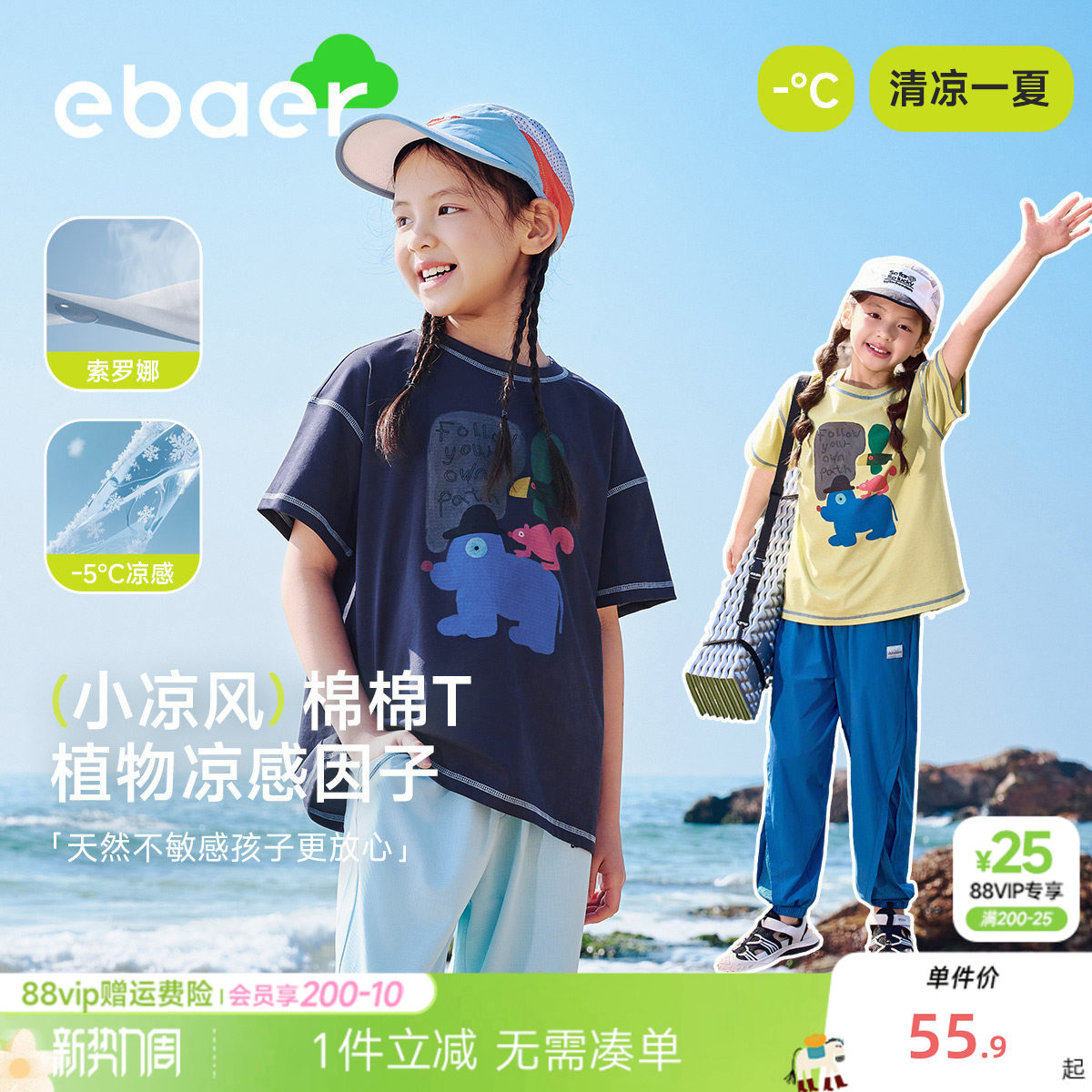 ebaer儿童短袖T恤2026夏装新款男童凉感抗菌体恤女童宽松百搭上衣