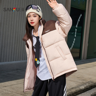 三福羽绒服2025新款冬季英文刺绣拼格立领宽松保暖外套女装505216