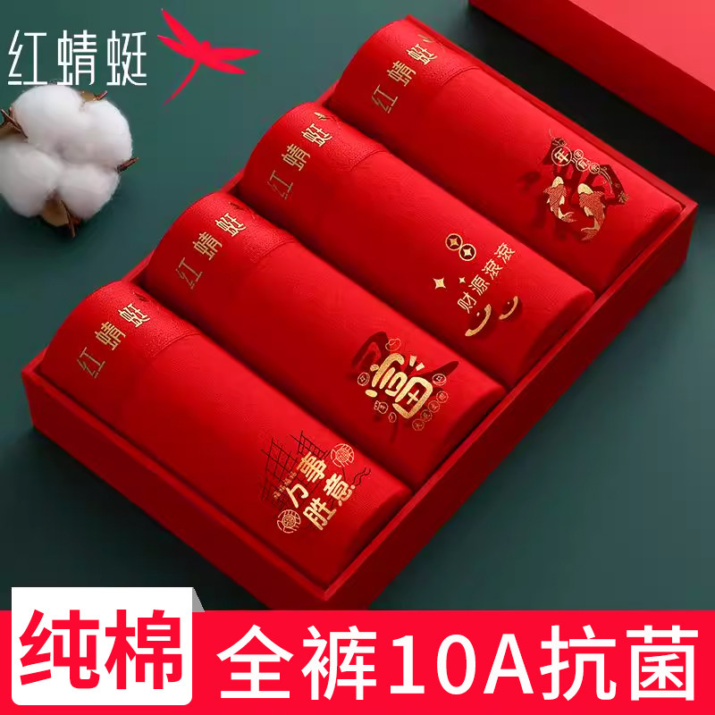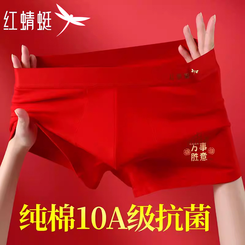 红蜻蜓男士本命年内裤男纯棉平角10A抗菌红色马年喜庆大码四角裤