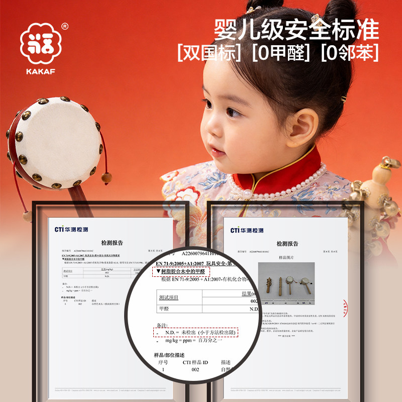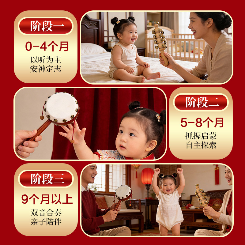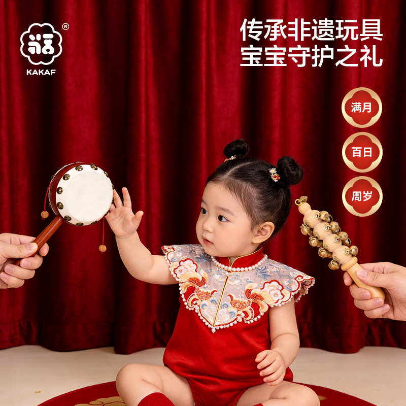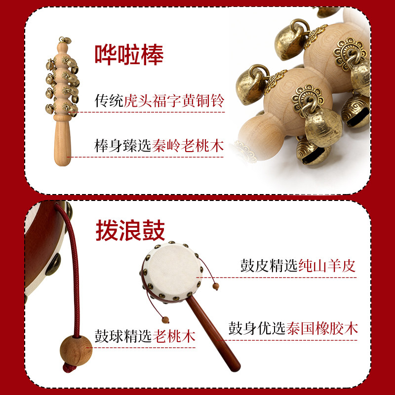 桃木羊皮拨浪鼓和哗啦棒黄铜老式手工婴儿可啃咬手摇鼓新生儿礼盒