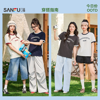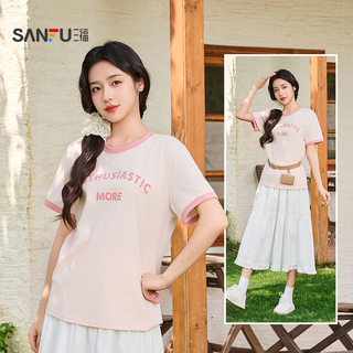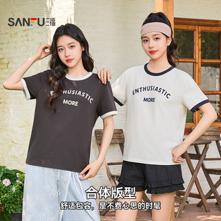 三福短袖T恤2026新款夏季简约休闲撞色圆领英文印花短款上衣女装