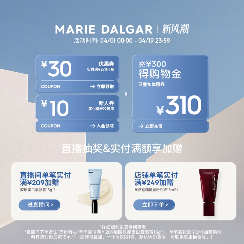 :原价227元,现在领取38元优惠券,预估到手189元,玛丽黛佳种籽气垫2.0~到手45g;【到手3套:1正2替+试色卡5g+粉扑*3】专为干皮与混干肤质设计,玛丽黛佳种籽气垫2.0升级配方,上妆服帖不卡粉,带来自然柔雾妆效。添加保湿成分,帮助肌肤维持水润状态,同时具备防蹭防汗特性,持妆更安心。轻盈质地,透气不闷肤,轻松打造清透无瑕肌感。