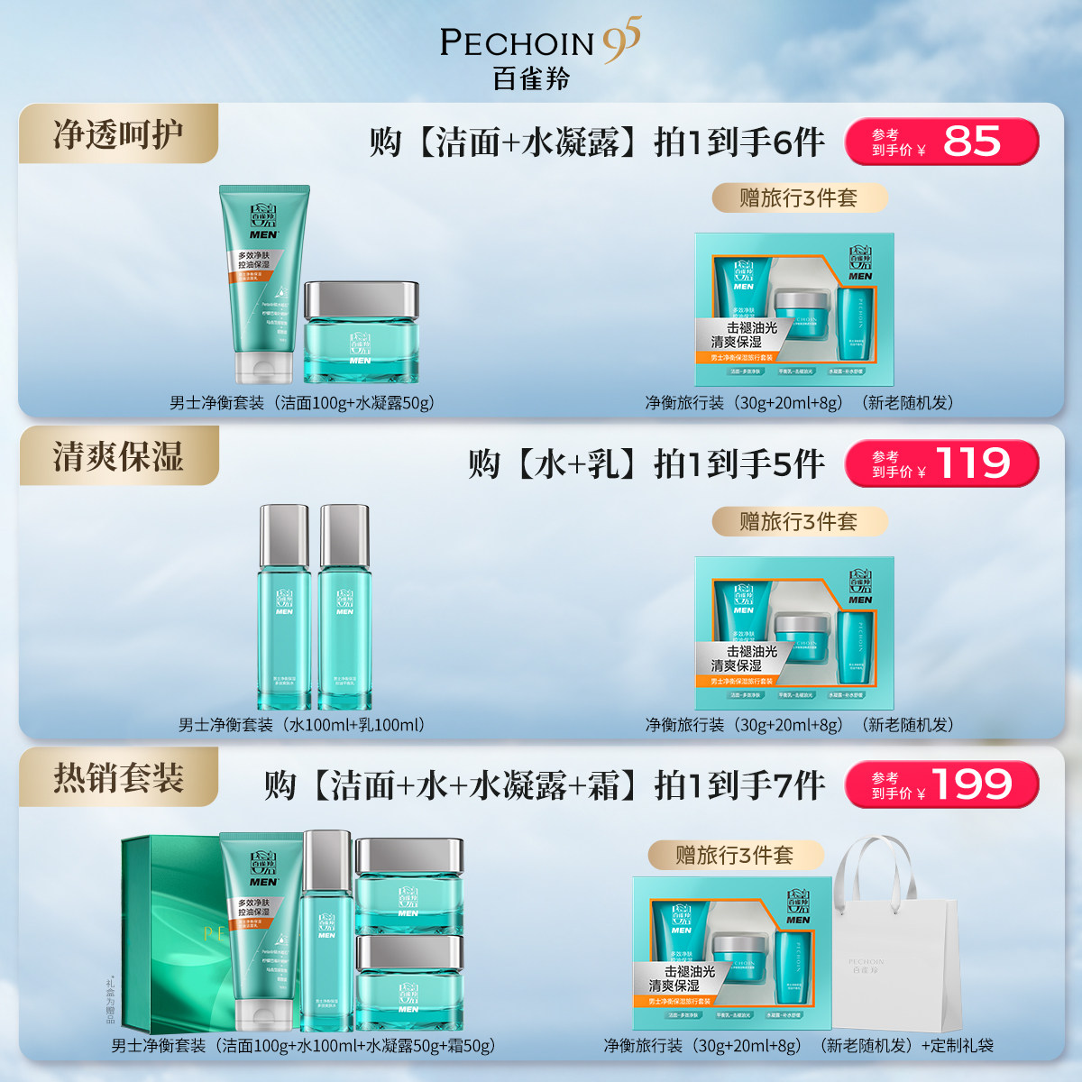:原价209元,现在领取10元优惠券,预估到手199元,百雀羚男士净衡水乳套装补水清爽;【送男友礼物】百雀羚男士水乳套装控油护肤化妆品官方旗舰店正品!:买就送净衡旅行装焕新版(30g+20ml+8g)