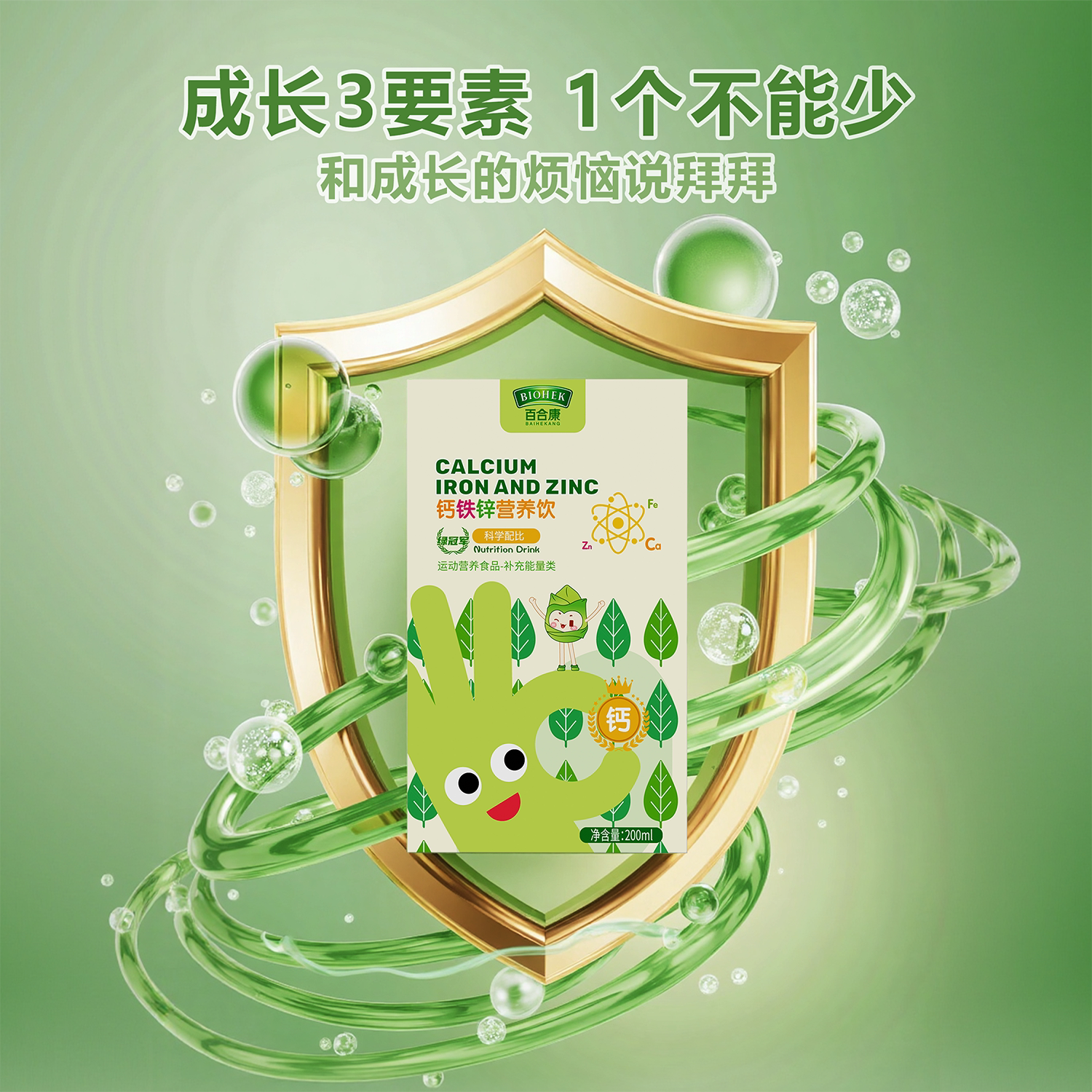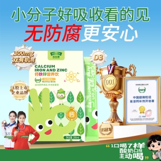 百合康绿冠军钙铁锌口服液儿童液体钙维生素D3柠檬酸钙K2直饮包