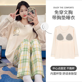 新中式国风竹叶睡衣女春款带胸垫长袖长裤甜美少女家居服套装a3