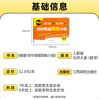 :原价17.8元,现在领取7元优惠券,预估到手10.8元,金太阳教育2024版初中同步测试卷全科套装;金太阳教育2024版卷霸易错周练小卷”是一套针对初中七、八年级(初一、初二)的同步专项训练测试卷,覆盖语文、英语、生物、道德与法治、历史、地理、数学、物理等学科,适配人教版教材