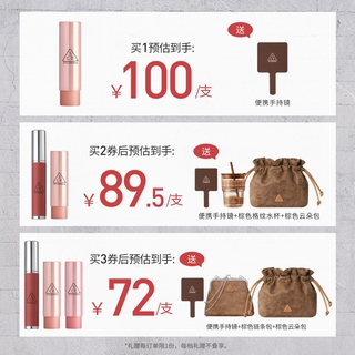 :原价167元,现在领取9元优惠券,预估到手158元,3CE好气色润唇膏30变色裸色镜面拍2件;拍2件。叠4元金币预估150到手2件。叠消费券后预估132元,单件66元,若掉落红包更低价。送棕色手持镜+棕色格纹水杯+棕色云朵包。3CE好气色润唇膏,滋润显色,打造自然好气色!拍3支仅需198元,每支仅66元,优惠叠加更划算!