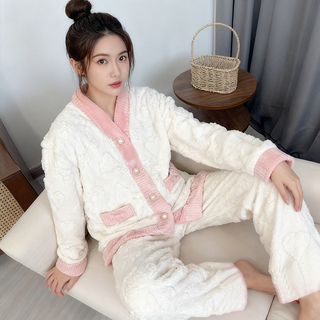 小香风女秋冬季加厚V领开衫式家居服套装宽松睡衣大码长袖可外穿