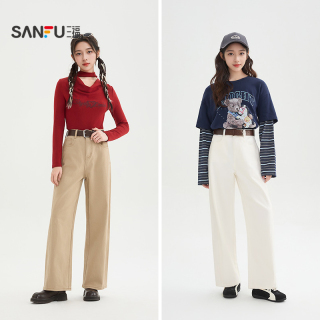 三福牛仔裤女2026新款春季时尚弯刀裤宽松卡其色长裤子女装515777