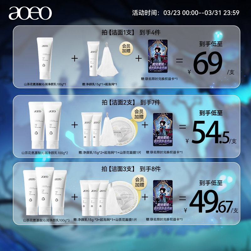 :原价69元,现在领取5元优惠券,预估到手64元,AOEO山茶花氨基酸敏感舒缓洗面奶;【首单+淘金币到手更优惠】山茶花氨基酸洁面,清洁毛孔+温和不刺激+舒缓修复!!5种氨基酸深层清洁!适合敏感肌!不起泡也滋润!!