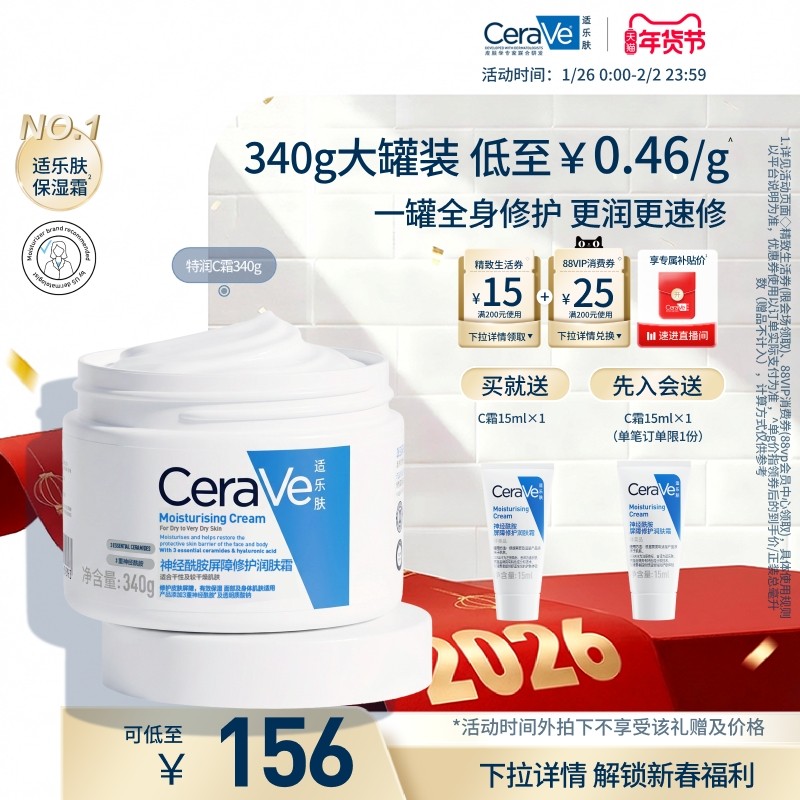 :原价88元,现在领取22元优惠券,预估到手66元,CeraVe适乐肤秋冬补水C霜85g;入会赠:C霜15g,先拍0.01权益再买正装加赠:C乳30ml; 张凌赫同款CeraVe适乐肤秋冬补水保湿滋润面霜修护! 拍85g,叠金币4.26+消费券160-20到手57左右 拍454叠金币4.26+消费券160-20到手132