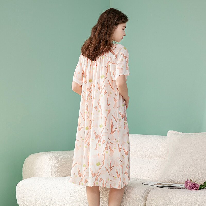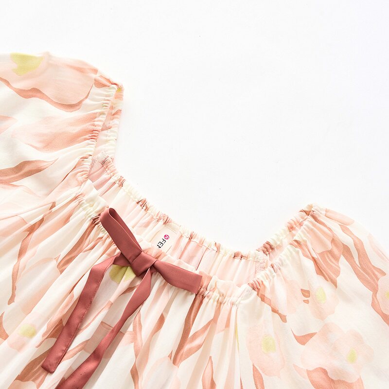 芬腾七夕礼物新睡裙薄款弹性娃娃领短袖蝴蝶结家居田园风睡裙花女