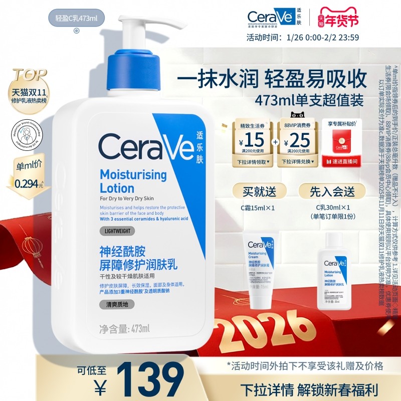 :原价109.12元,现在领取15元优惠券,预估到手94.12元,CeraVe适乐肤C乳保湿润肤身体乳液;【到手236ml适乐肤C乳!】专业修护肌肤屏障,24小时保湿不闷痘,清爽好吸收,敏感肌必备!美国皮肤学,水润一整天!